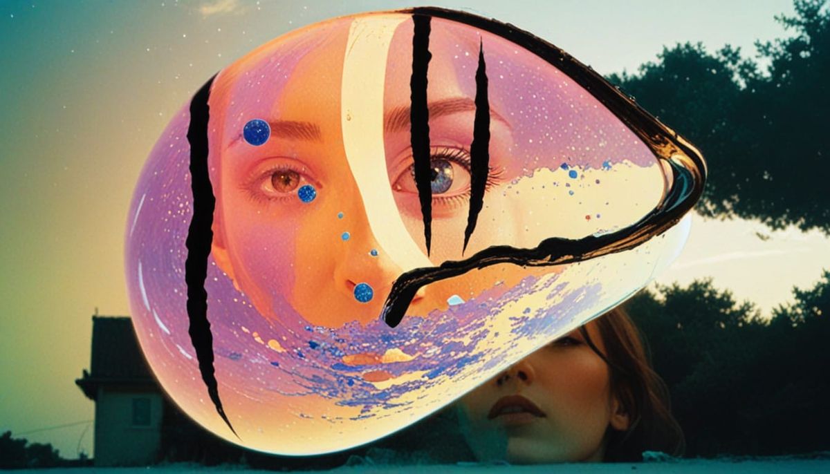 This image features a surreal abstract portrait of a cracked porcelain figure with holes, resembling a glass eye. It is rendered with an iridescent glow, evoking a starry sky and floating stardust.
