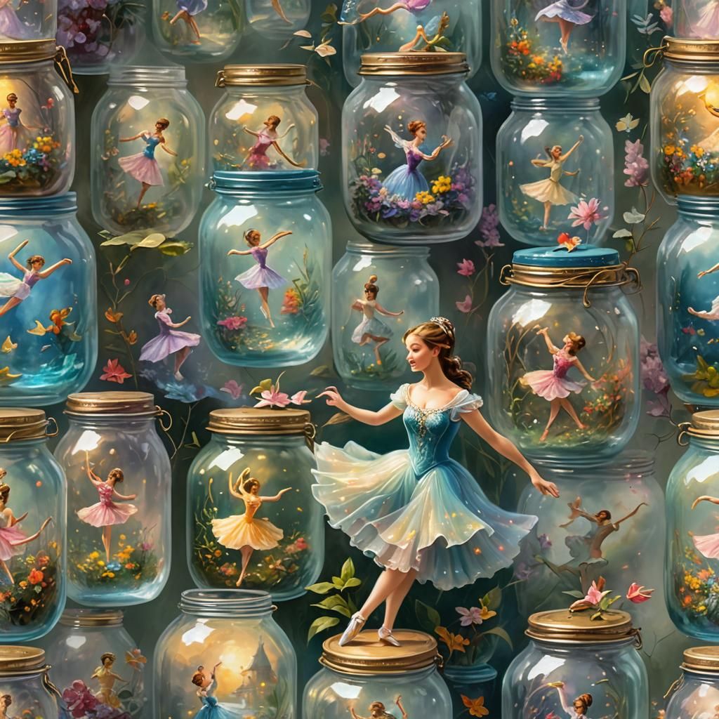 A captivating image of jars containing dancing ballerinas surrounded by a misty, ethereal atmosphere. This vibrant, hyperdetailed illustration evokes cosmic astral themes in mixed media.