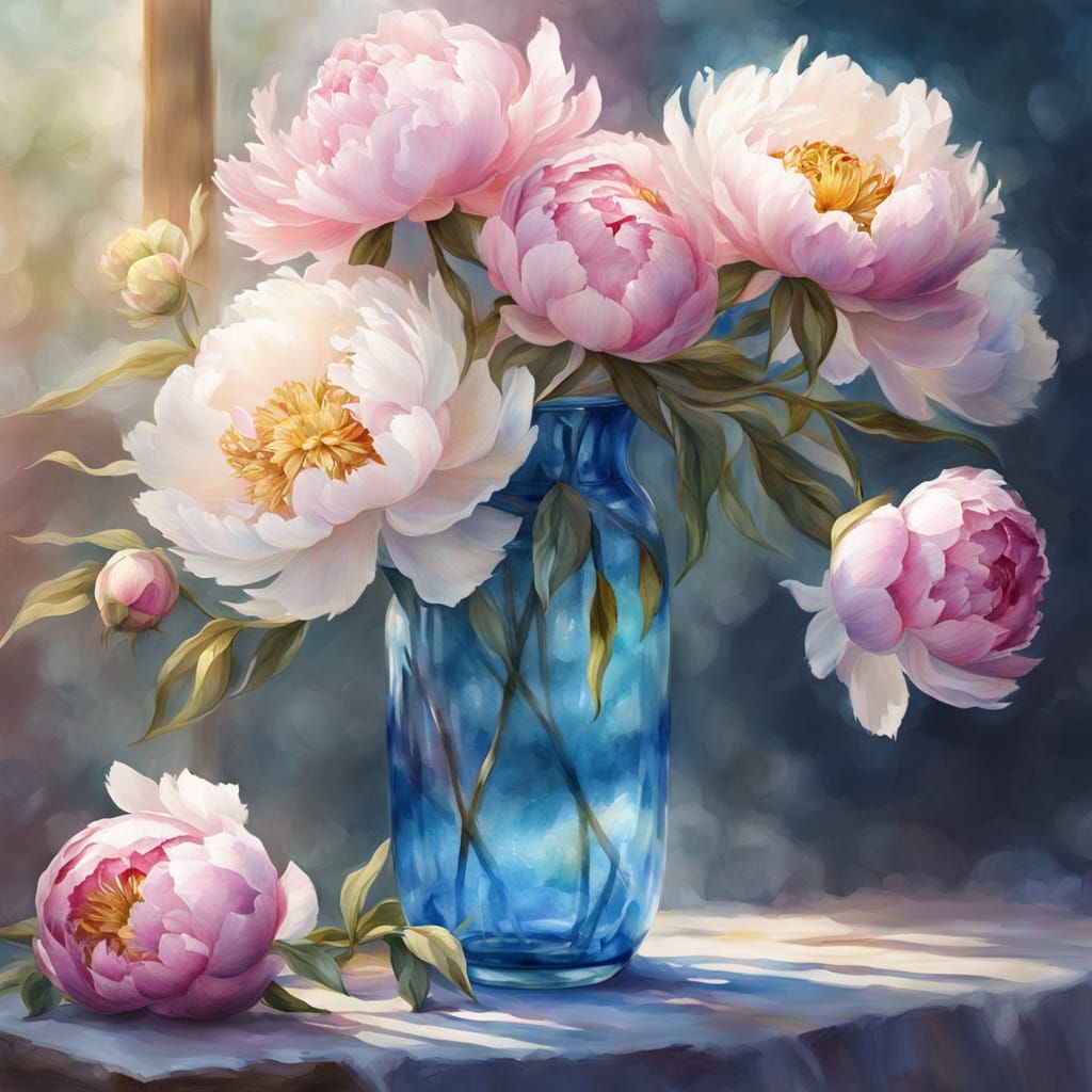 This image shows pink and white peonies in a blue glass vase, rendered as watercolor art. The image features soft brushstrokes, delicate petals, and warm golden lighting.