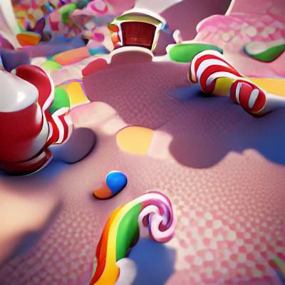 This image shows a vibrant and colorful landscape, rendered in Unreal Engine, resembling a fantastical candy land with surreal elements and a dreamlike quality.