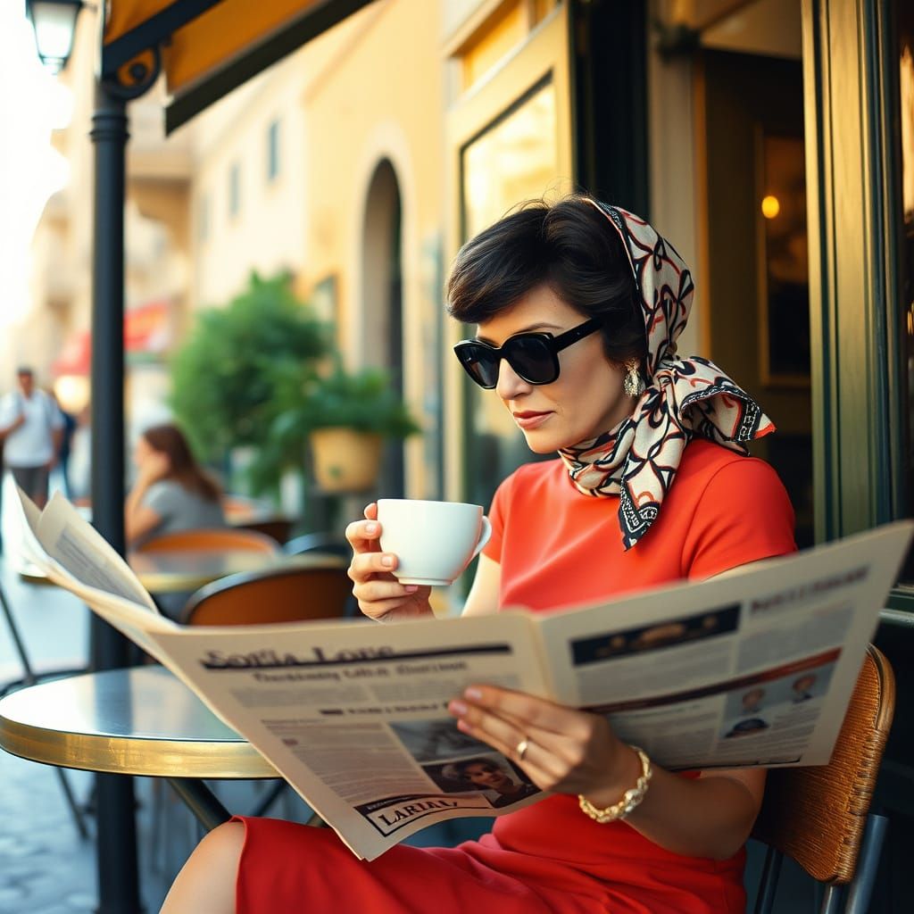 This image shows a woman in 1960s attire at a Roman cafe, enjoying espresso and a newspaper. The warm, golden light and vintage styling evoke classic Italian cinema.