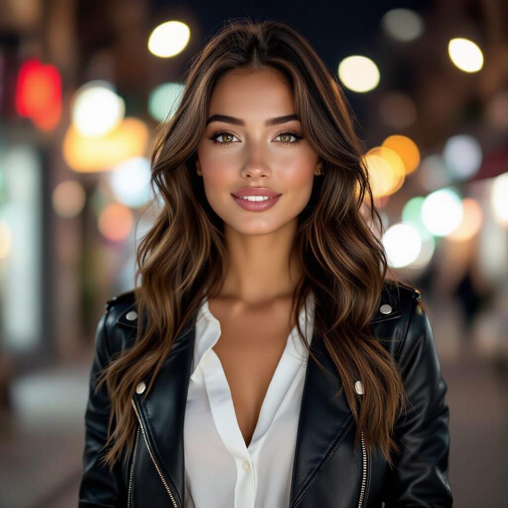 This image shows a young woman with brown hair and honey eyes in a street style photoshoot. The photograph captures her charismatic smile with natural lighting, reminiscent of high-definition DSLR photography.