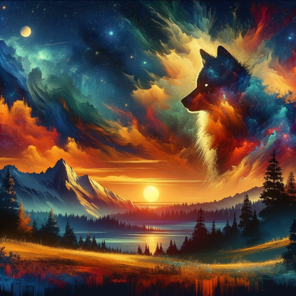 This image shows a majestic wolf silhouetted against a vibrant, double-exposed sunset over a peaceful mountain range. It features a dreamlike atmosphere with thick, textured brushstrokes in gouache and watercolor.