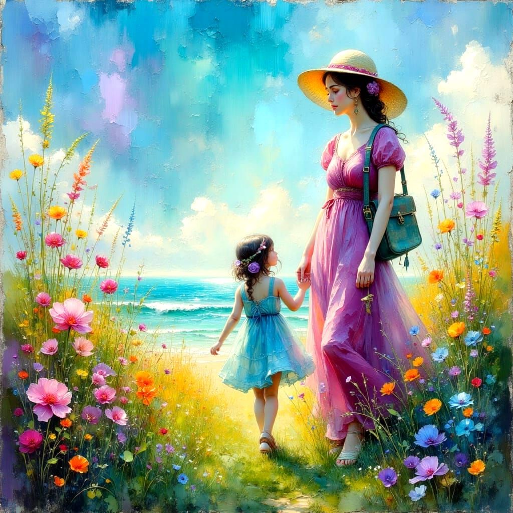 A watercolor portrait of a mother and daughter in casual clothes. The image features colorful feathers, ferns, and sunlight, with an impasto oil painting style and textured brush strokes.