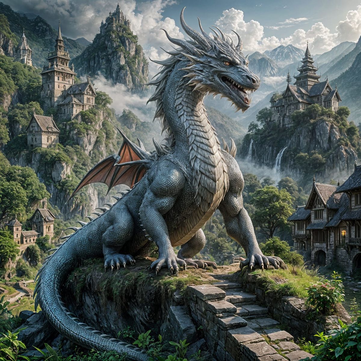 This image shows a dragon with white iridescent scales and braided silver hair guarding an overgrown village in a valley. The photograph is hyperrealistic with cinematic lighting and vivid colors.