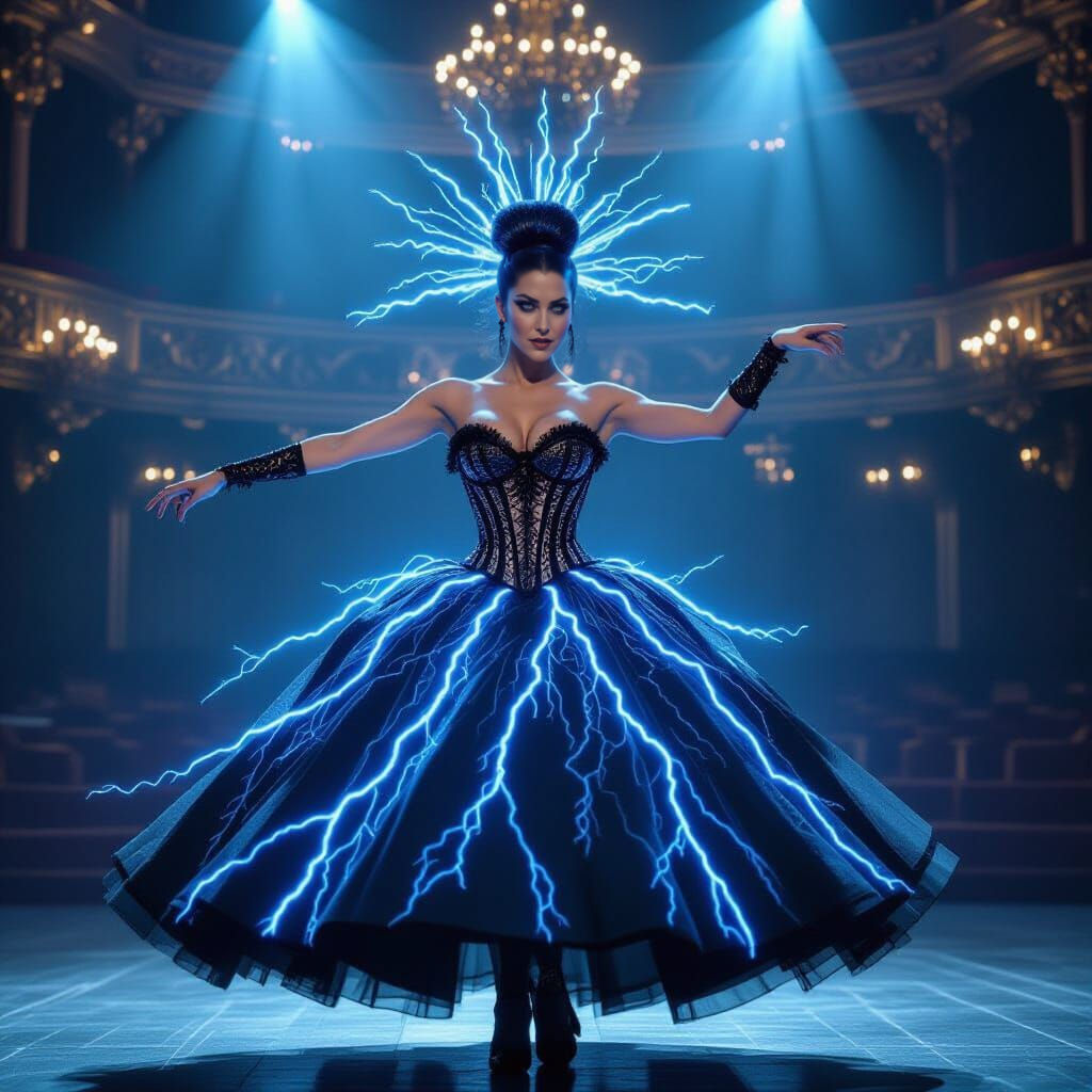 This image features a woman with a black bun hairstyle, wearing a black lace corset and a dazzling dress made of electric blue lightning bolts. She dances on an opera stage with a hyperdetailed background, illuminated by dramatic backlight.