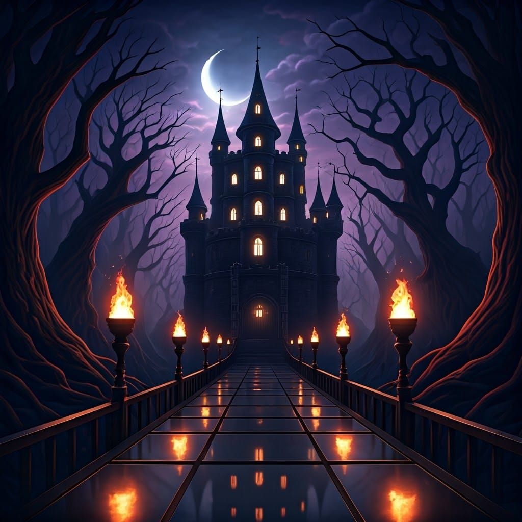 This image depicts a breathtaking, high-contrast fantasy landscape featuring a majestic castle set against a deep purple sky with a crescent moon glow. Twisted trees and a glass drawbridge surround the castle, while a mysterious void pit creates a sense of foreboding, blending darker sensibilities with s...