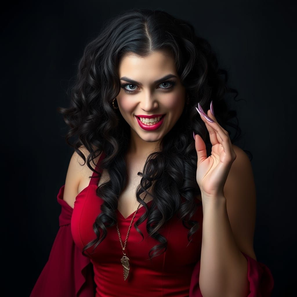 This image shows a captivating portrait of a voluptuous young woman with sharp fangs. She is dressed in red and set against a dark, medieval-inspired backdrop, creating a seductive atmosphere.