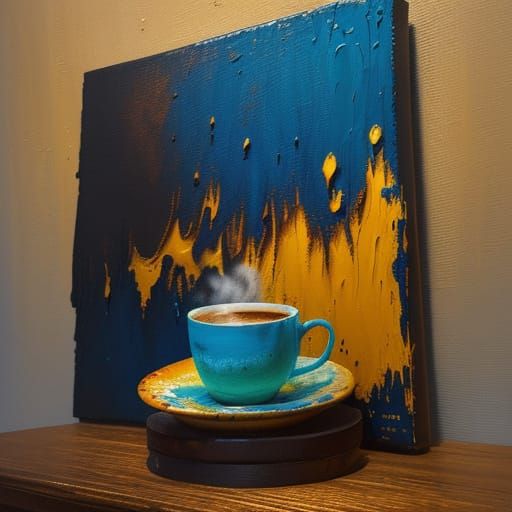 This image shows a steaming coffee cup on a wooden table, rendered with thick, impasto brushstrokes and vibrant, contrasting colors in a neo-impressionist style.