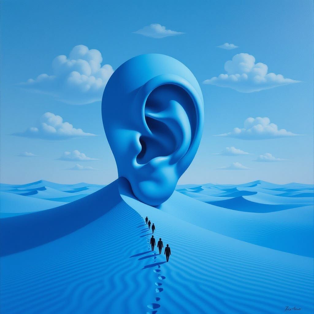 This image depicts a surreal monochromatic blue landscape. A giant human ear rises from blue sand dunes, with tiny figures approaching. Ethereal clouds shaped like sound waves fill the sky, creating a dreamlike atmosphere.
