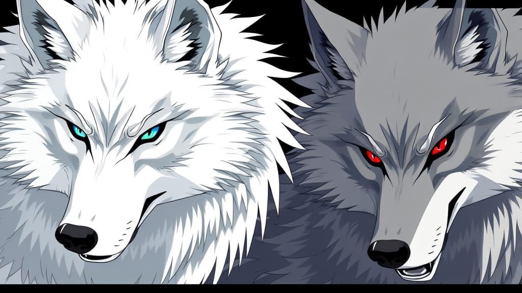This image shows three wolves with distinct eye colors amidst a war scene. Rendered in a vibrant anime style, the artwork captures the intensity of the conflict.
