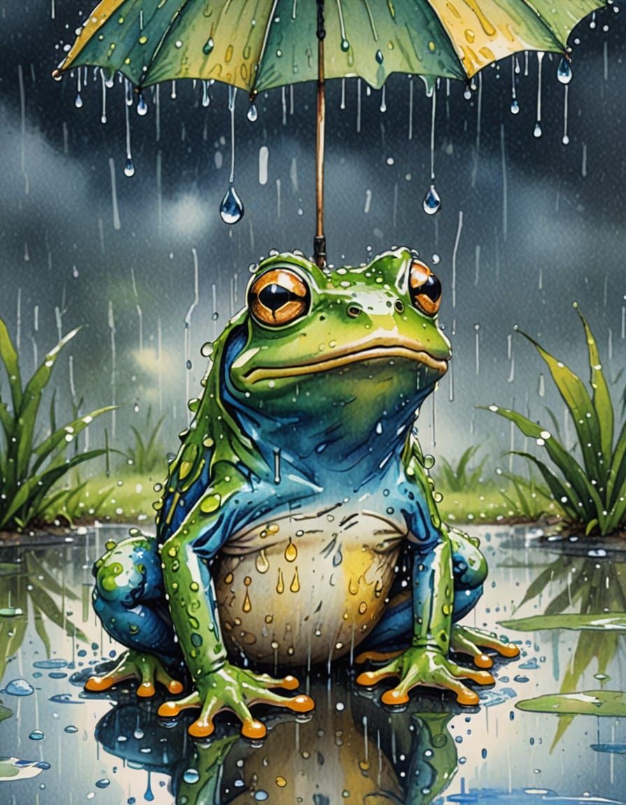 This image shows a surprised manga-style frog caught in a downpour. The scene is rendered in watercolor ink, using a soft focus and vibrant wet-on-wet techniques with warm and cool lighting.