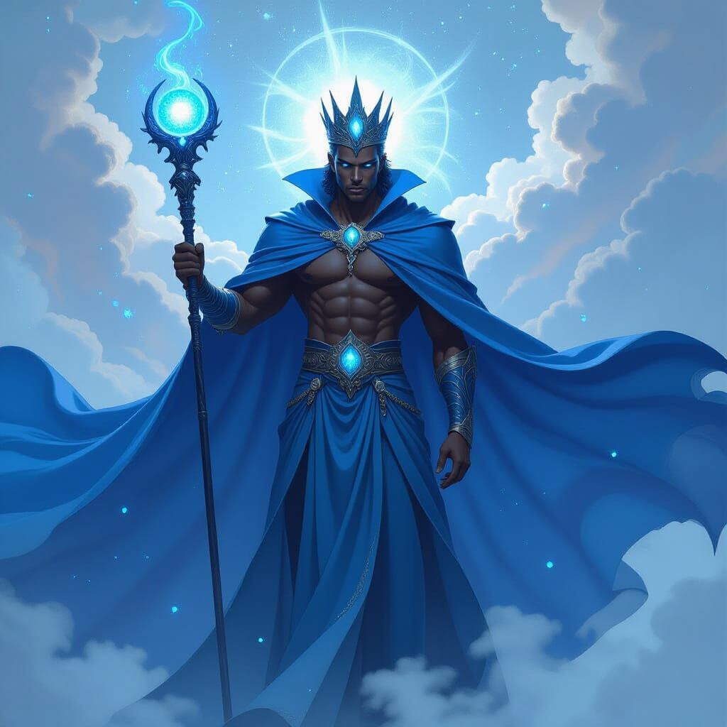 This epic fantasy concept art depicts a regal figure with brown skin and blue-dyed hair, wearing a large blue cape and crown. He holds a glowing staff amidst swirling blue dust in a cosmic sky. The style features dramatic lighting and saturated colors.