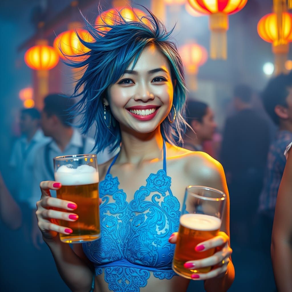 This image shows a vibrant Lunar New Year party scene featuring a smiling young Chinese woman with blue hair. She is holding a Chinese beer and is depicted with hyperrealistic textures in a cinematic style.