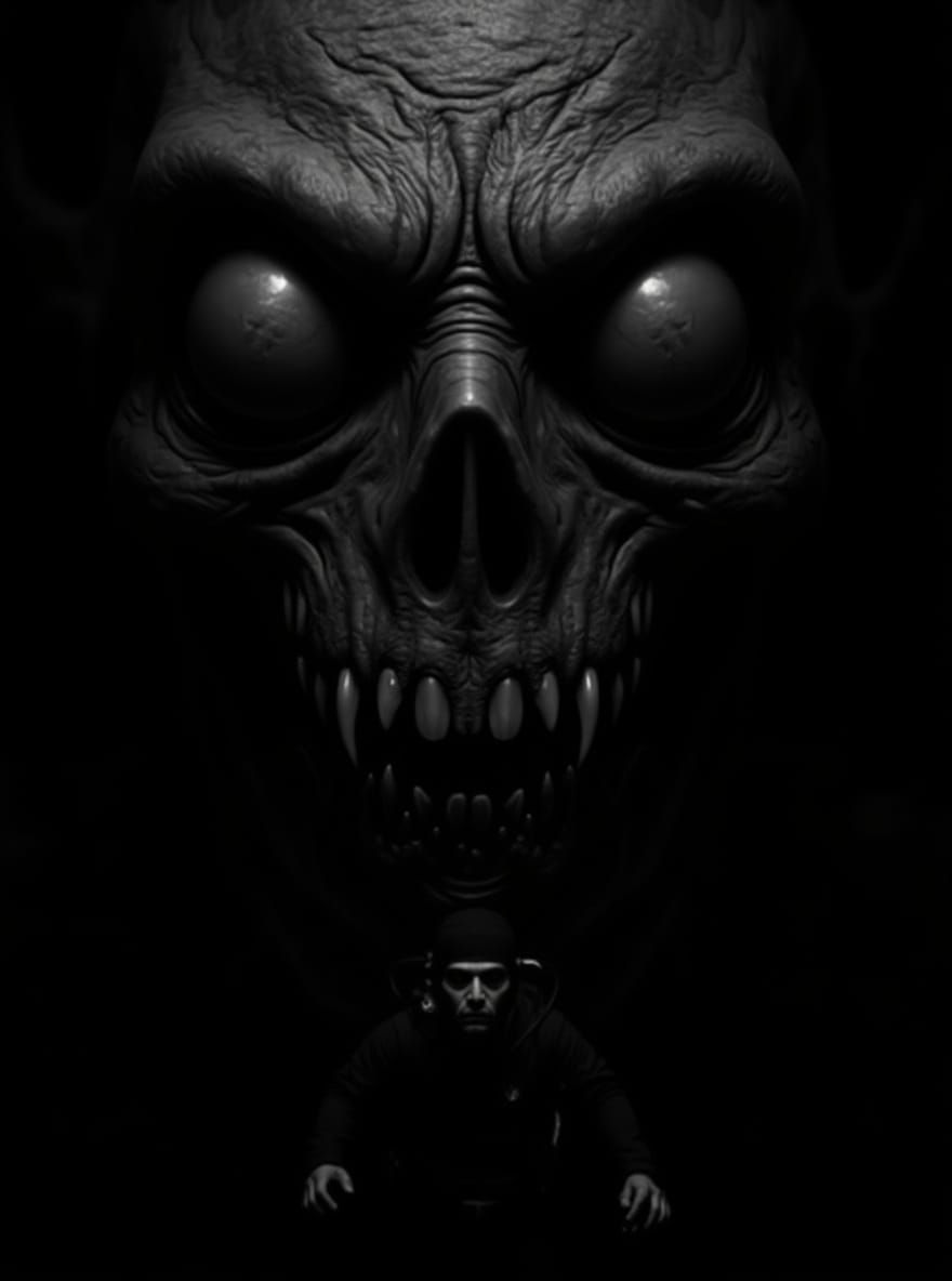 This image depicts a vintage, black and white found footage scene of a scuba diver facing the colossal Bloop sea monster in the deep ocean. The diver's expression shows ultimate despair.