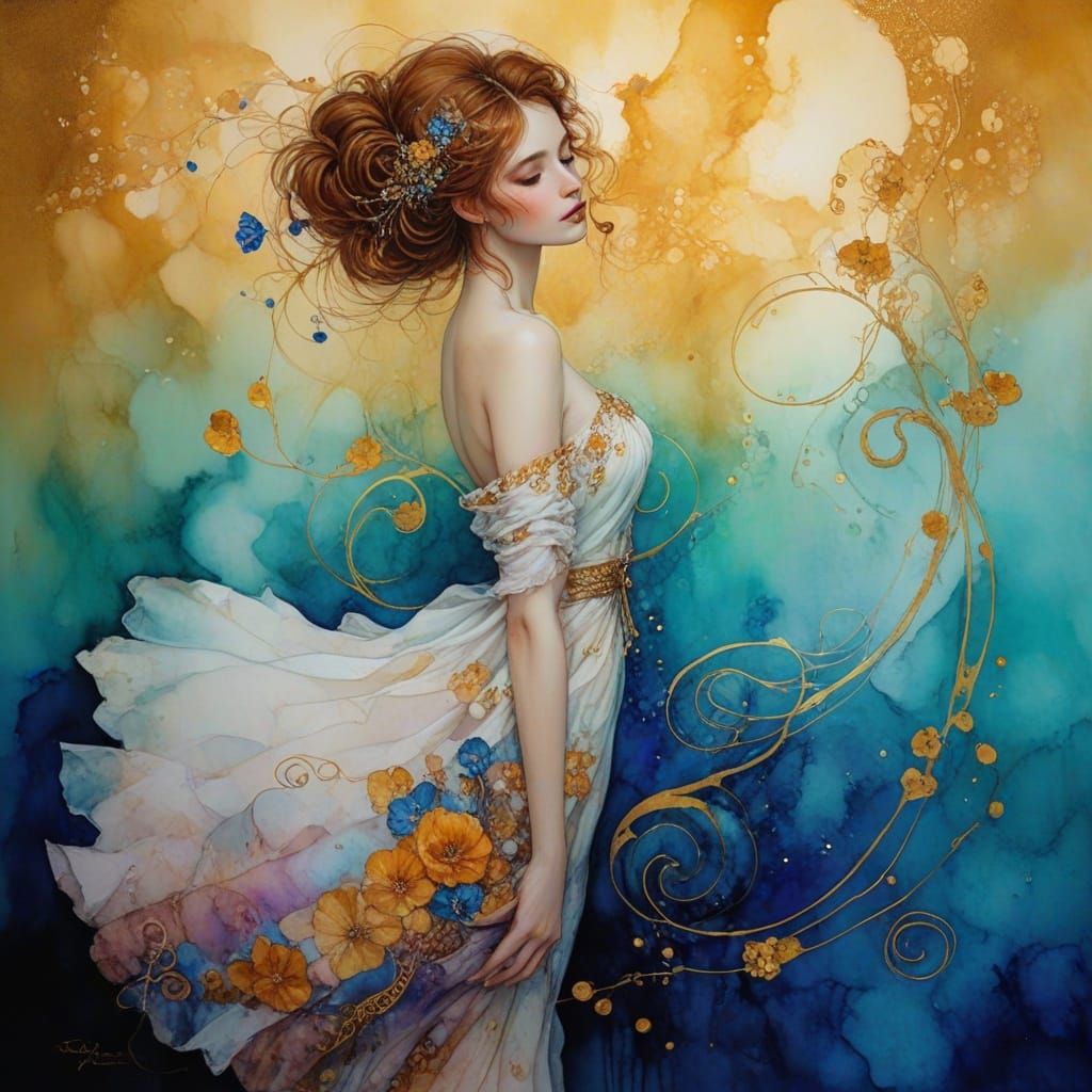 This image shows an alcohol ink painting of a coy figure in a sweet pose. The artwork blends elements of Art Nouveau with bold, expressive lines.