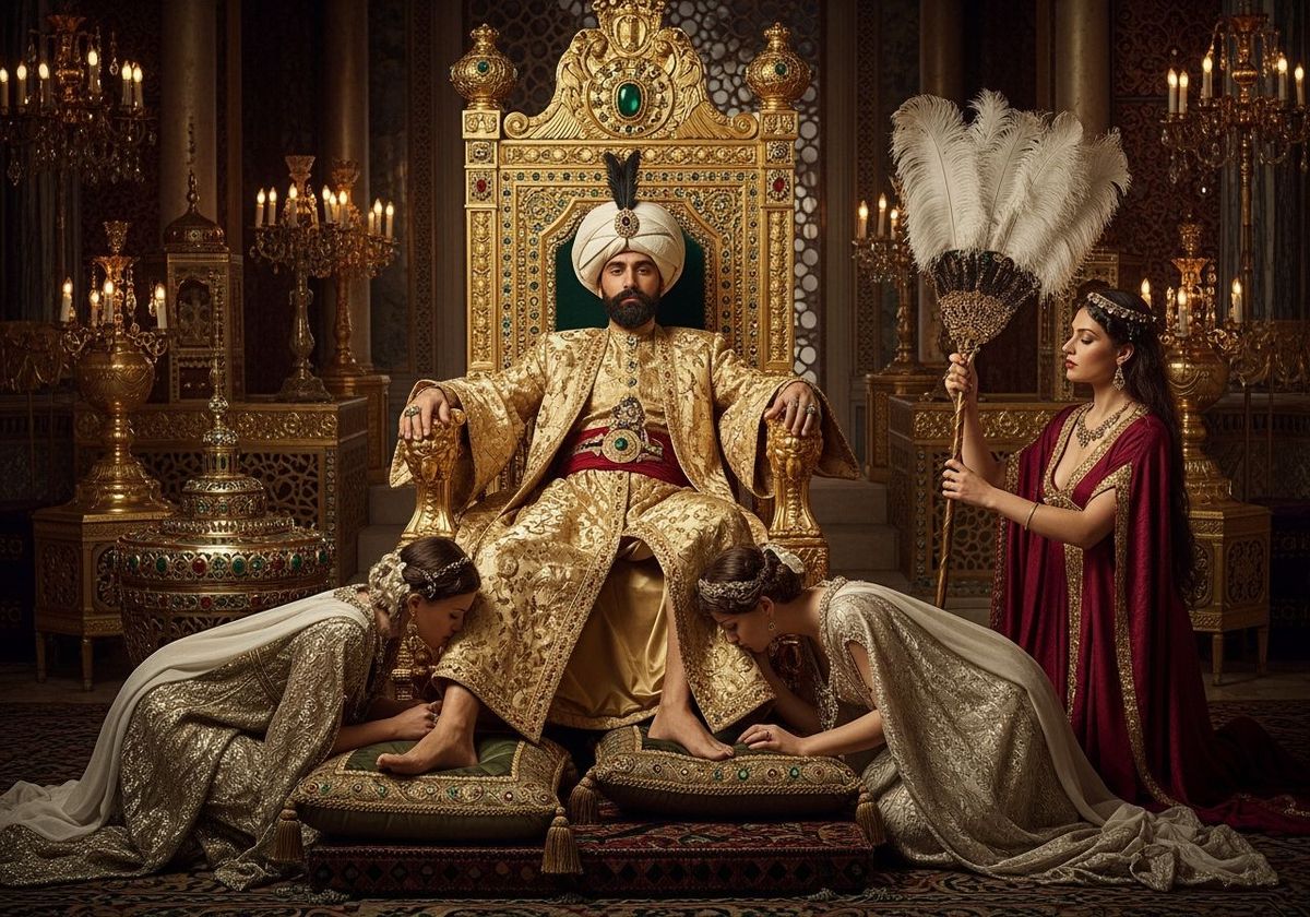 This image shows an Ottoman Sultan in a gold silk kaftan, reclining on an opulent throne. Courtly photography with natural lighting and sharp focus captures intricate details and textures.