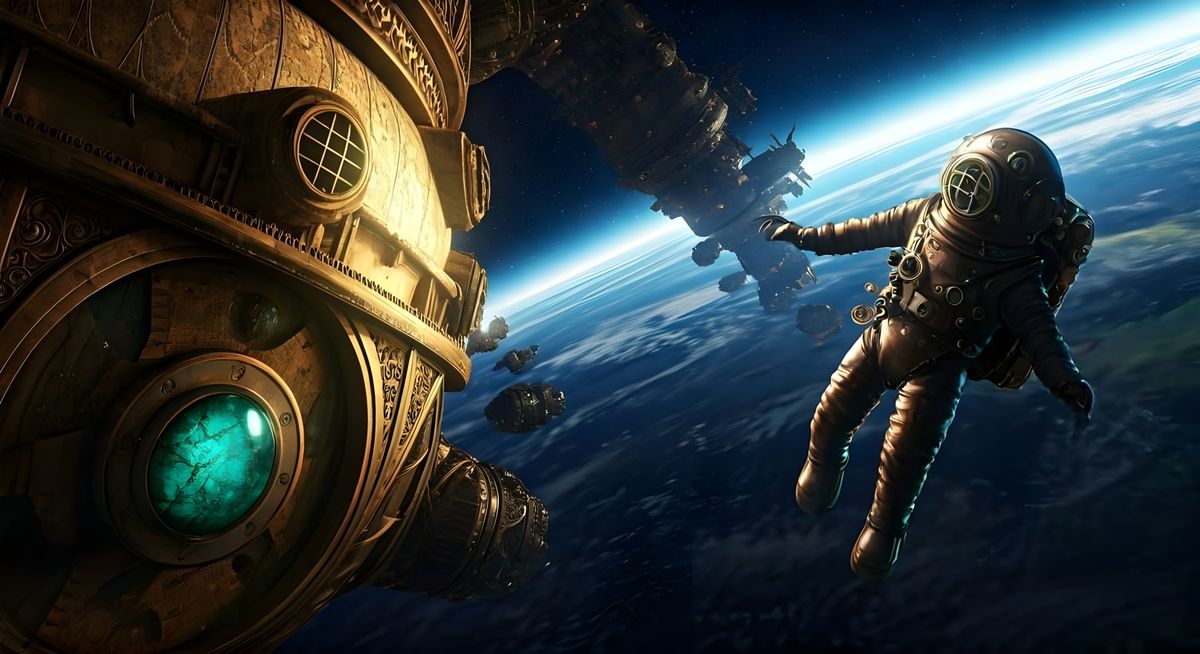 This vibrant image features a Steampunk astronaut floating next to a stunning Victorian-era inspired space station, adorned with gears, copper, and gemstones, set against the colorful atmosphere of a luminescent planet.