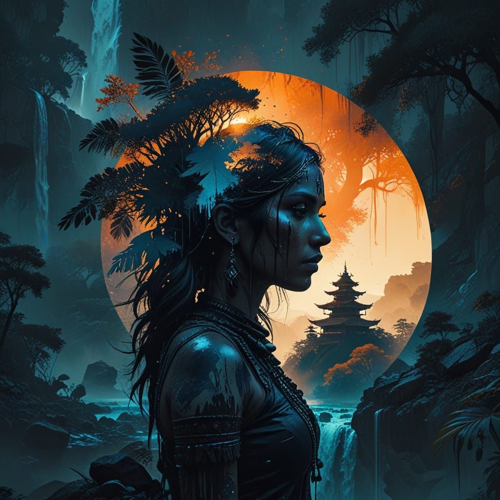 Double exposures:: Silhouette portrait of an Indian girl by Andreas Lie:: A mysterious Indian landscape with a waterfall :: Bojan Jevtic + Ashley Wood :: Watercolor art, intricate detailed, hyperdetailed, maximalist, psychedelic, post-apocalyptic, photorealistic, 8k resolution concept art, Unreal Engine, ...