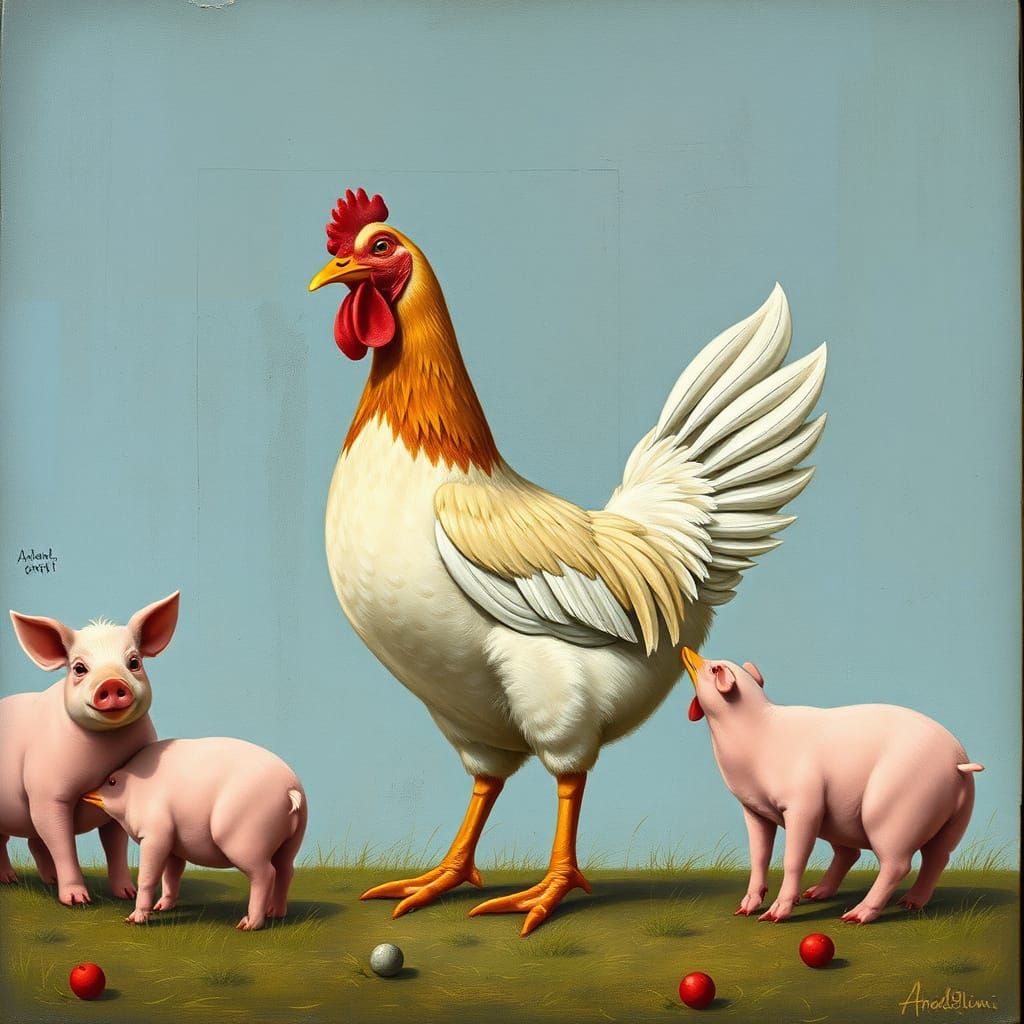 This image shows a serene collective farm scene with a chicken quacking, plump piglets, and a contented mother animal, set against a natural backdrop in an impressionist aesthetic.