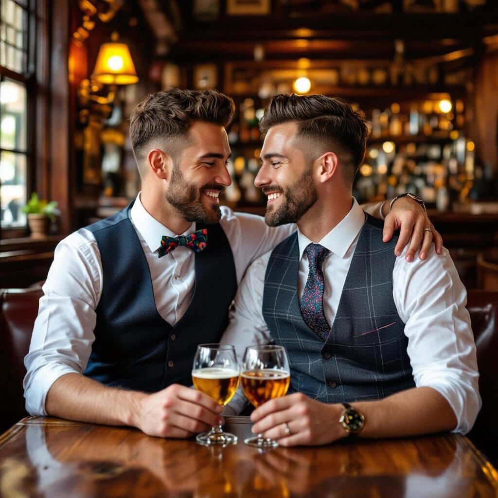 This image shows a handsome gay couple in a pub. The artwork captures the subjects with perfect anatomy and a traditional English aesthetic.