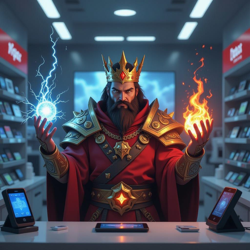 A World of Warcraft shaman demonstrates a smartphone in a modern store. He wears gladiator armor and a crown, with elemental magic crackling from his hands in a blend of dystopian futurism and fantasy realism.