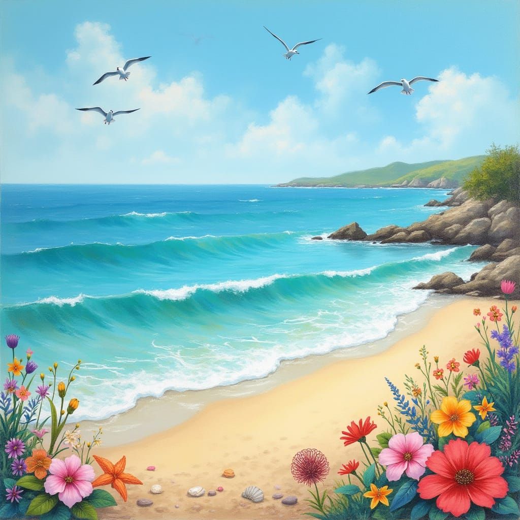 A serene beach scene with tropical flowers, seashells, and starfish on the sand. Gentle waves lap the shore under a clear blue sky with seagulls, in an impressionistic style.
