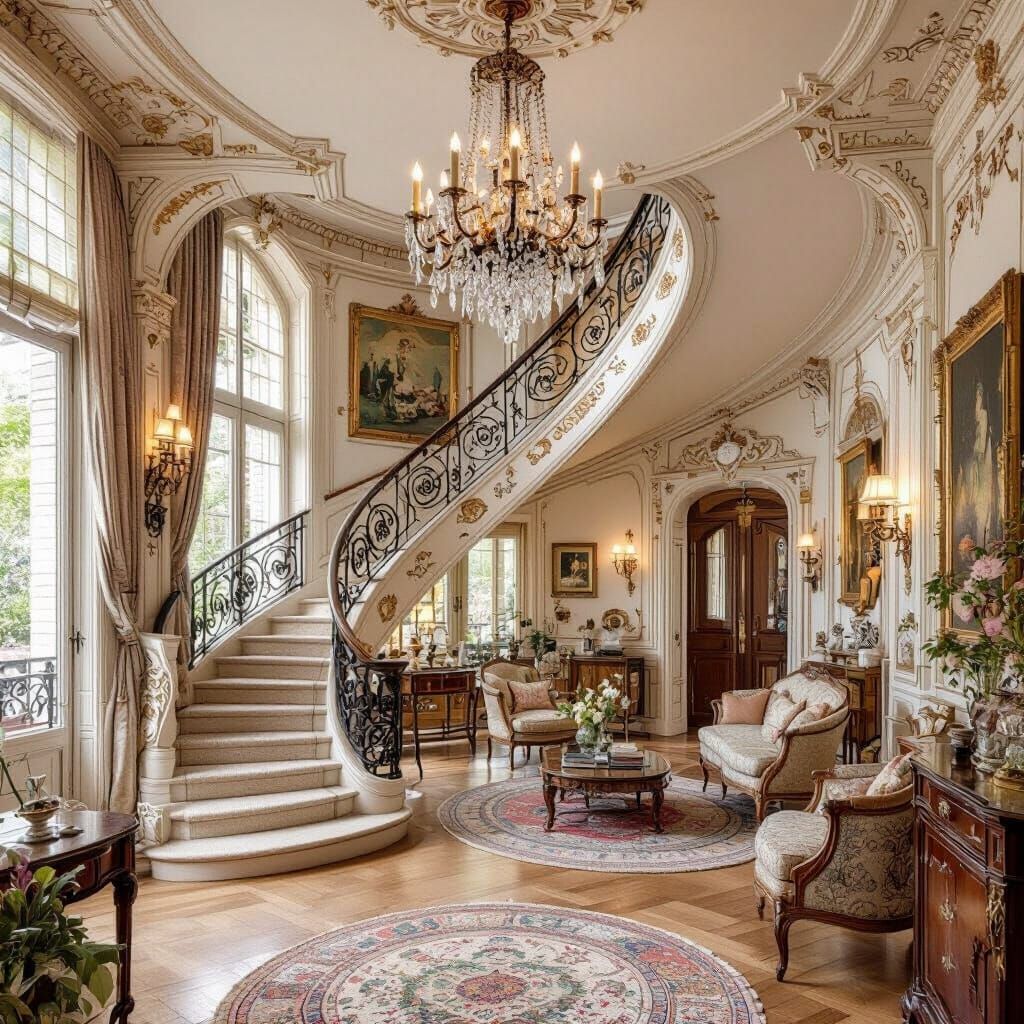 A view inside an elegant Belle Epoque French house. A three-story spiral staircase is the centerpiece, complemented by period furniture, a crystal chandelier and vintage art in a soft, warm light.