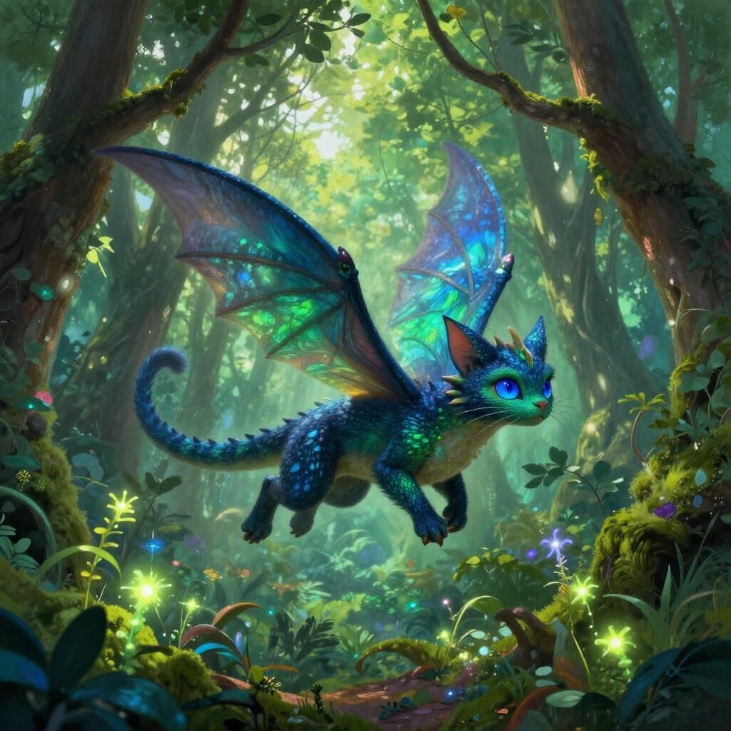A small, realistic cat dragon with iridescent blue and green fairy wings and sapphire eyes flies through a lush, ancient forest. Rendered in a whimsical fantasy art style with ethereal glow.