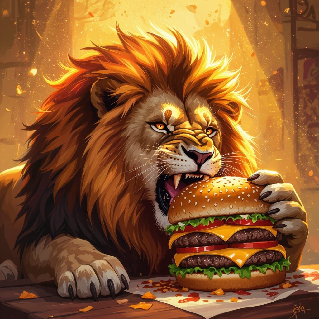 A vibrant image shows a majestic lion eating a huge burger in warm, golden light. The artwork has a fantastical style with dynamic brushstrokes, creating a surreal and expressive scene.