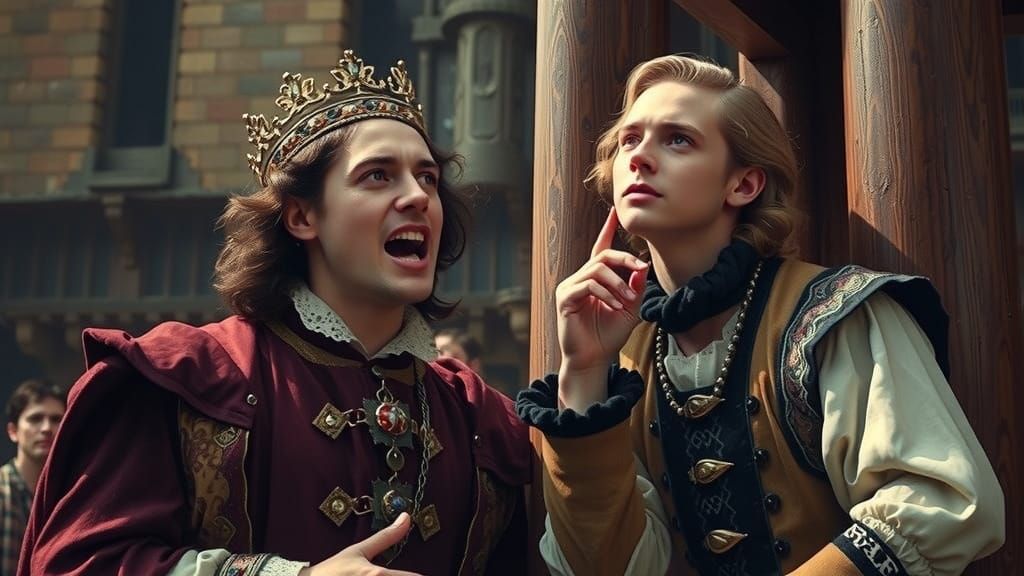 29 ys old William Shakespeare playing a role of a king on the back part of the stage of the Globe in kingly costume, Henry observing with awe