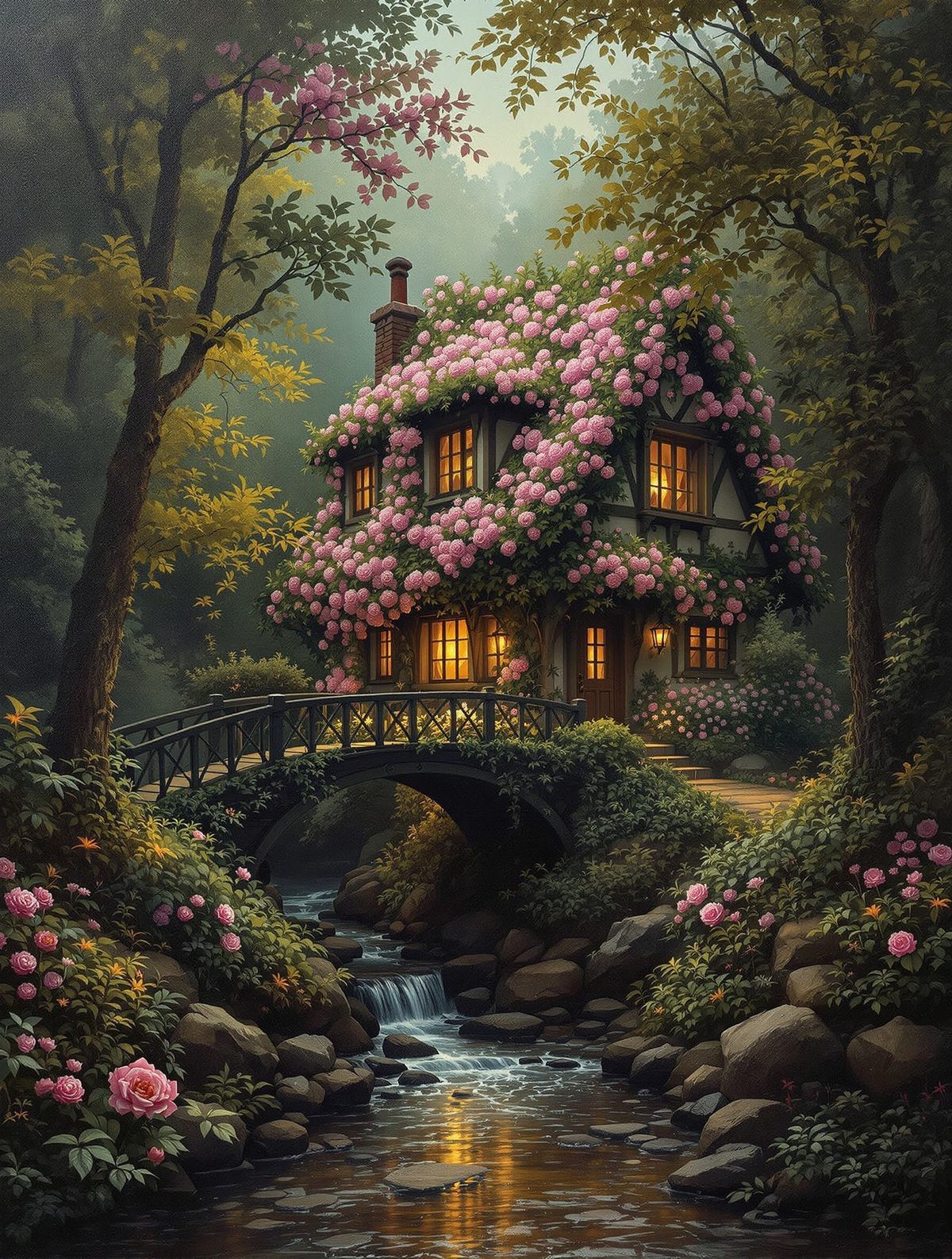 Easily generate your own dark fantasy forest scenes with flower-covered cottages and streams. Free and fun AI image creation.