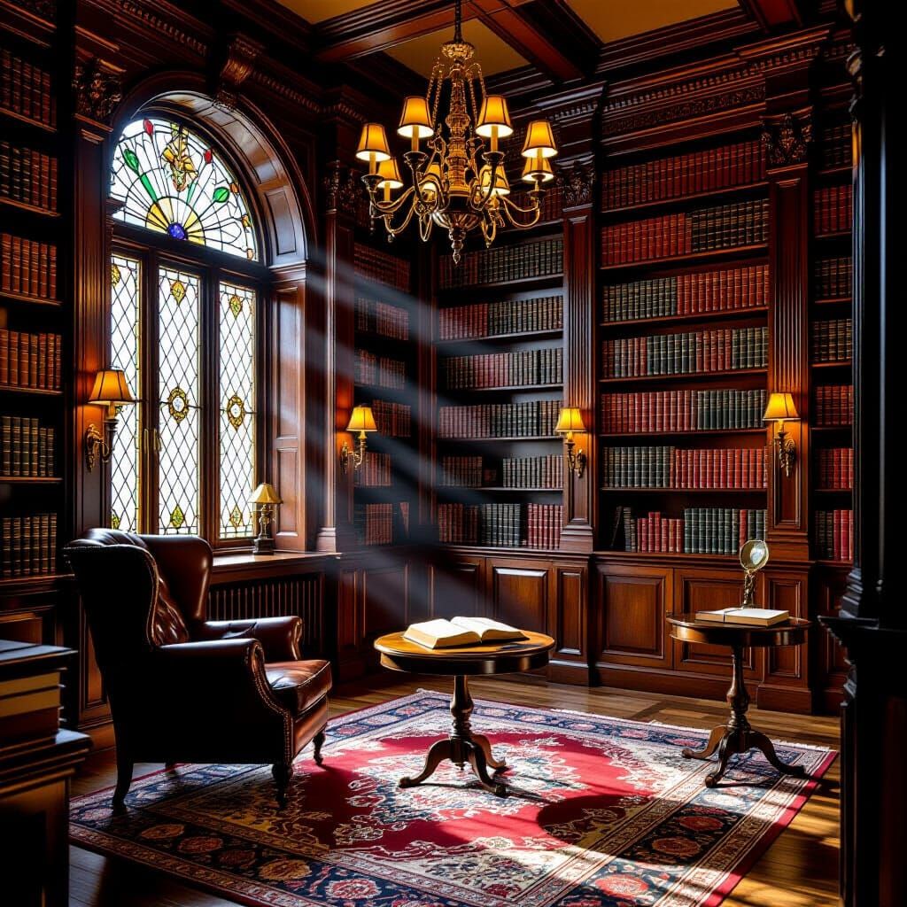 This image shows the interior of an old library with floor-to-ceiling bookshelves. A golden chandelier illuminates the room, highlighting a Persian rug and rustic armchair in a sepia-toned atmosphere.