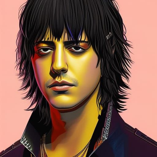 A hyperrealistic portrait of Julian Casablancas with vivid colors. The artwork captures a dramatic mid-shot with intricate detail and dynamic lighting in a splash art style.
