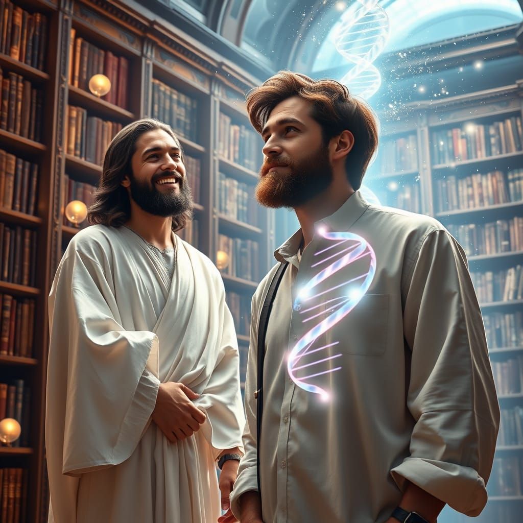 This image shows Jesus in a white robe standing next to a modern man in a cosmic library. They are looking at a DNA double helix hologram in a futuristic, mystical digital art style.