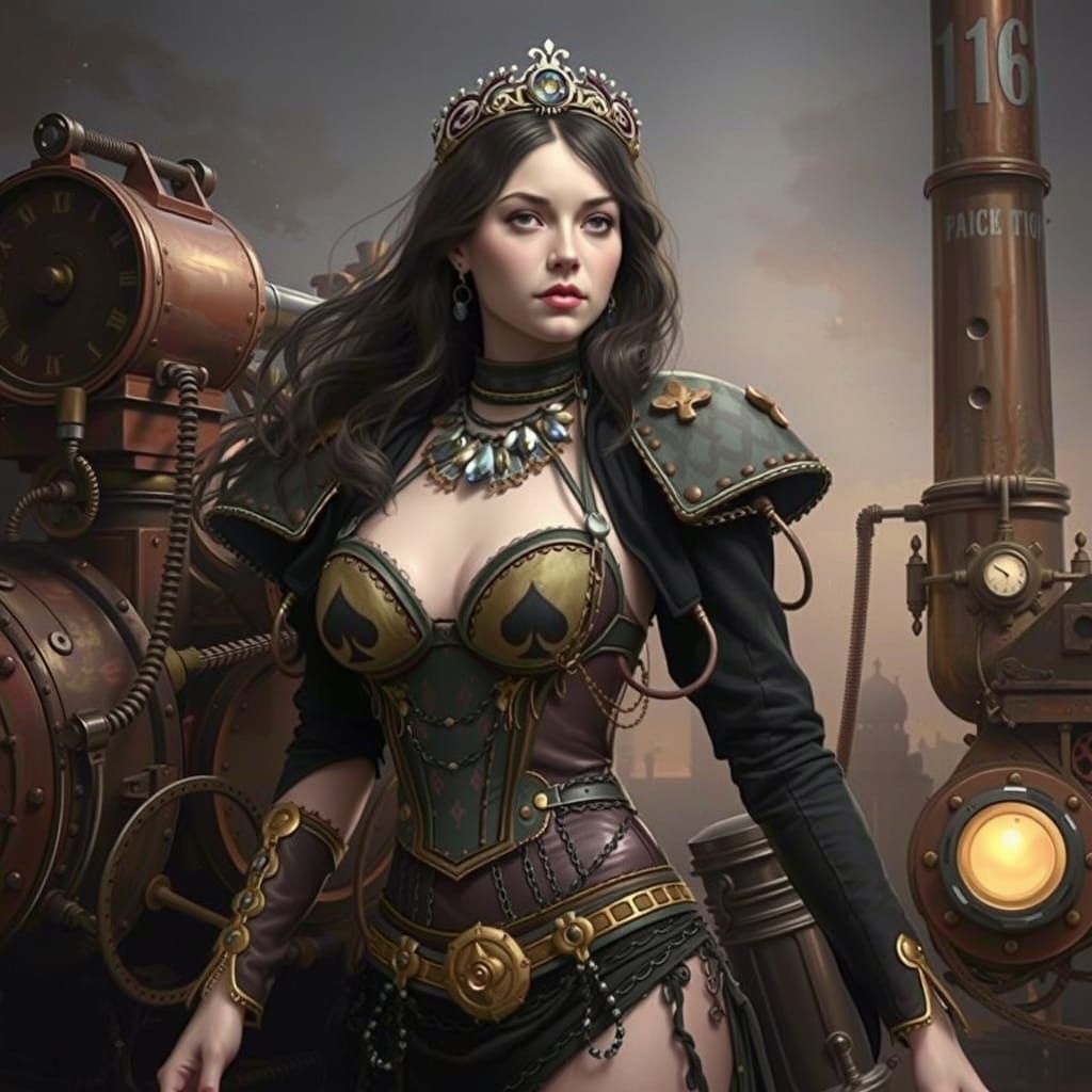 This image features a shy, young Queen of Spades in a unique spades bikini. The artwork is rendered in a style reminiscent of classic illustrative techniques, set against a steampunk backdrop with dramatic lighting.