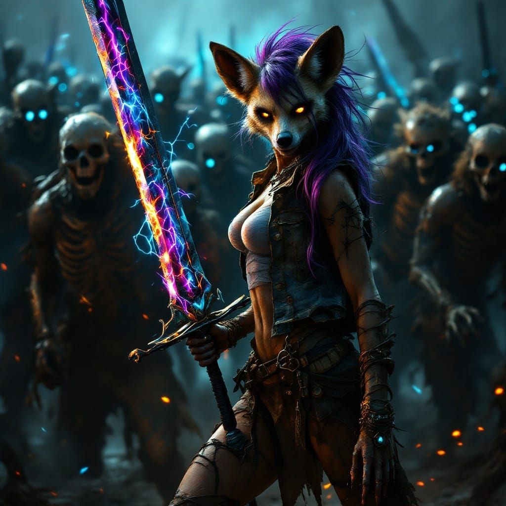 A stunning anthropomorphic she-hyena stands out against a dark, foreboding atmosphere, illuminated by flashes of eerie blue light. She wields a massive, otherworldly sword with a kaleidoscope of fuchsia and cerulean elements, as ghostly faces contort in agony.