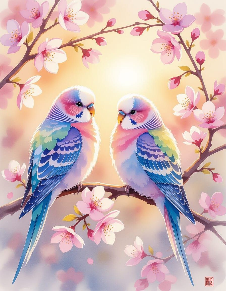 This image shows two fluffy parakeets in vibrant purple, blue, and pink hues on a sakura branch. Painted in an impressionist watercolor style with fine brushstrokes and a soft glow.