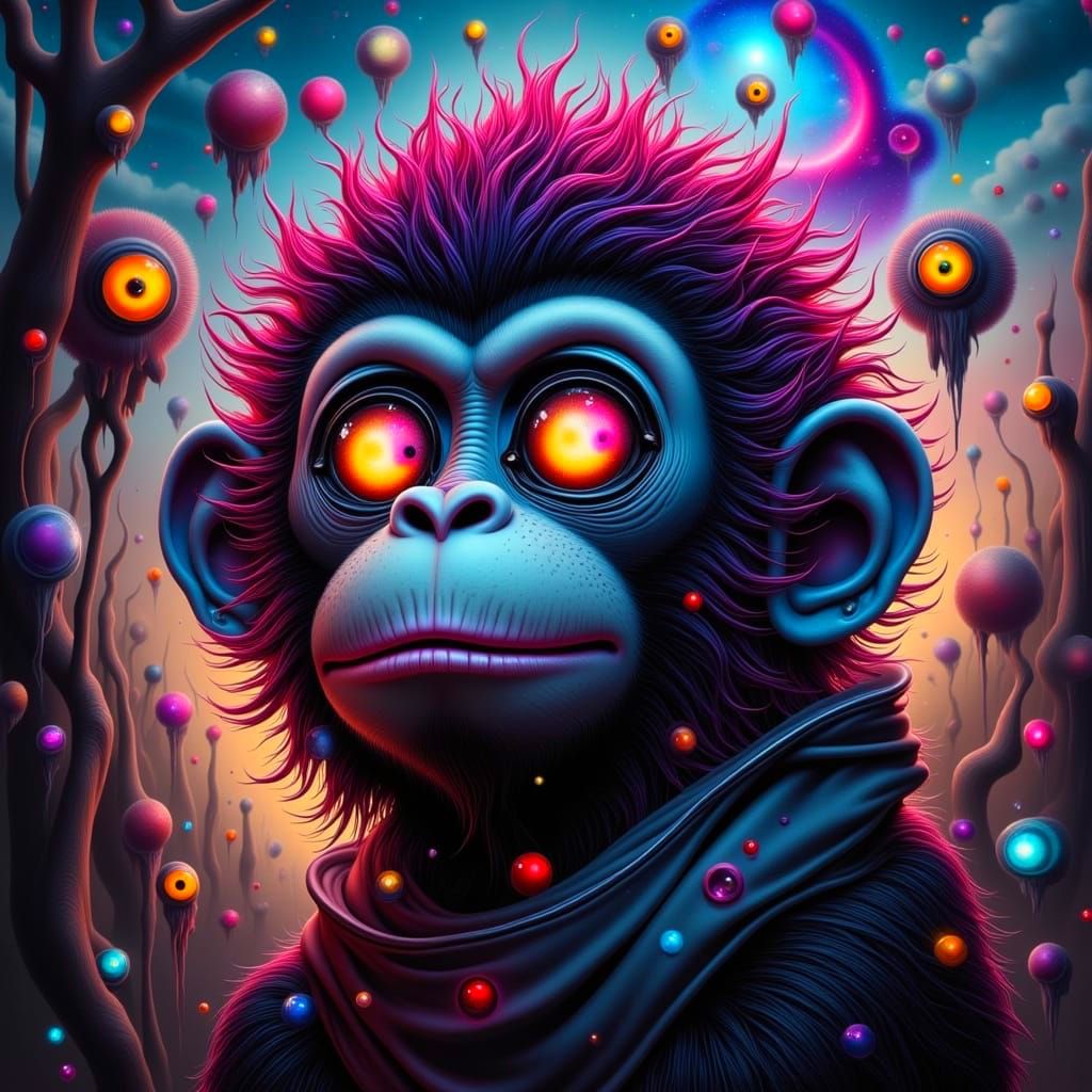 This image depicts a fantastical, creepy-cute monkey with big, curious eyes and tusks, set against a neon-lit, surreal backdrop, blending elements of sci-fi and fantasy art.