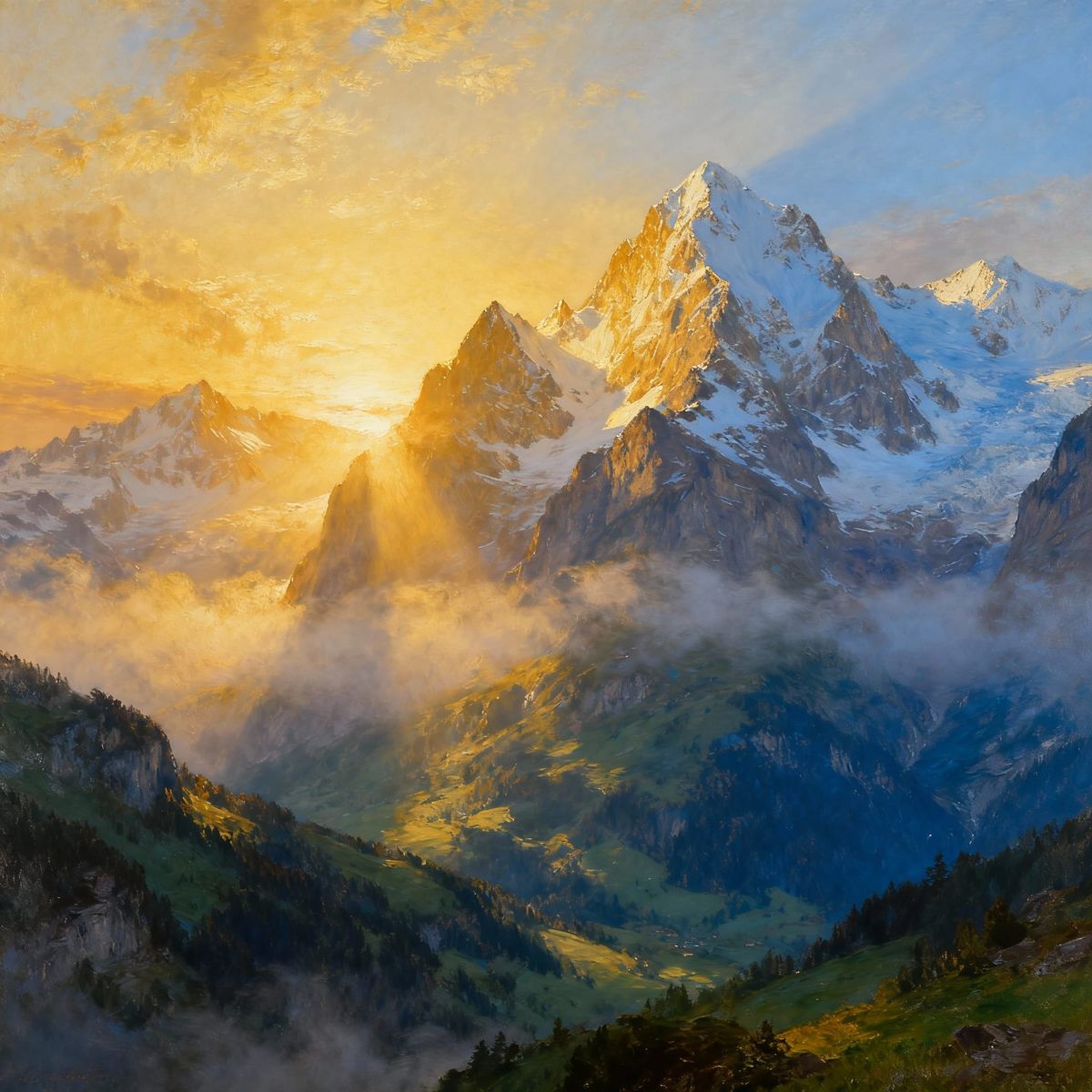 This image shows a serene Swiss mountain sunrise with golden light piercing through mist over jagged peaks. The painting captures profound peace and invigorating energy in a luminous landscape style.