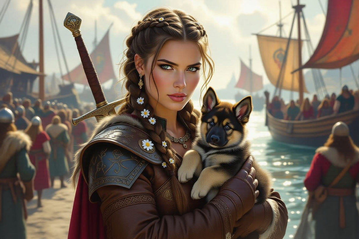This image shows a Viking woman with dark braided hair holding a German Shepherd puppy. She stands in a medieval harbor, dressed in leather, with a sword and edelweiss flowers. Sunlight highlights her face in a dramatic style.