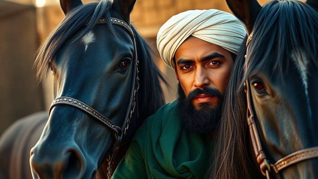 This image depicts a semi-realistic digital illustration of a 30-year-old warrior, Haji Jafar, preparing to ride his majestic black Arabian horse, Shahanshah, in a Baghdad stable, set against a backdrop of caravan gear, with warm, earthy colors and early morning light.