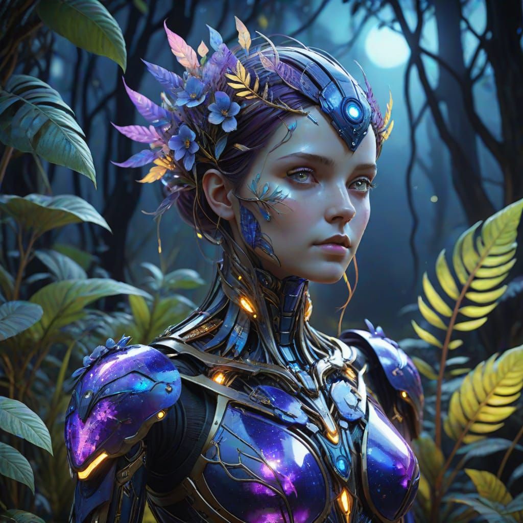 A striking picture of a porcelain android in a forest setting. The android features glowing panels and is surrounded by anatomical plants, rendered with vibrant colors and contrasting shadows, as watercolor concept art.