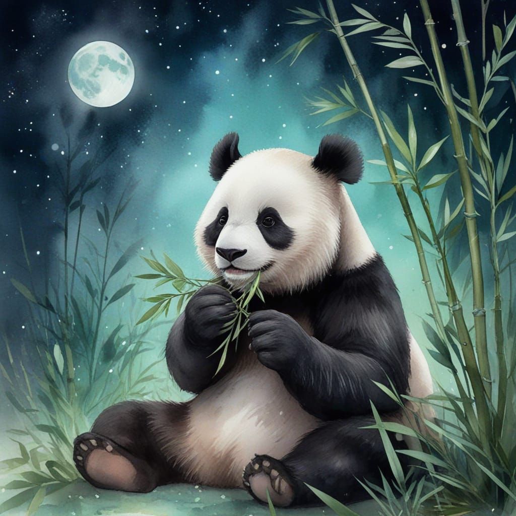 A charming image of a panda contentedly munching on bamboo amidst a bed of leaves. The artwork is rendered in dreamy watercolor style, with pastel colors and soft focus creating a magical, ethereal atmosphere.