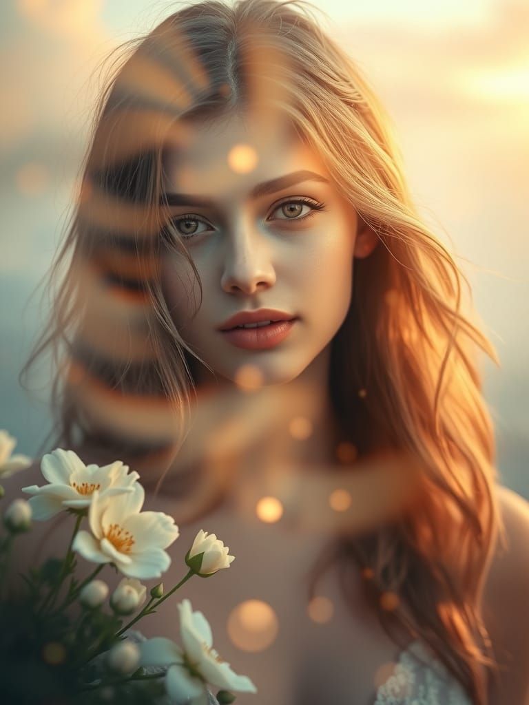 This image features a photorealistic young woman with luminous skin and delicate features, set against a soft, dreamy background of misty clouds, flowing water, and pastel-toned flowers, evoking a tranquil and intimate mood.