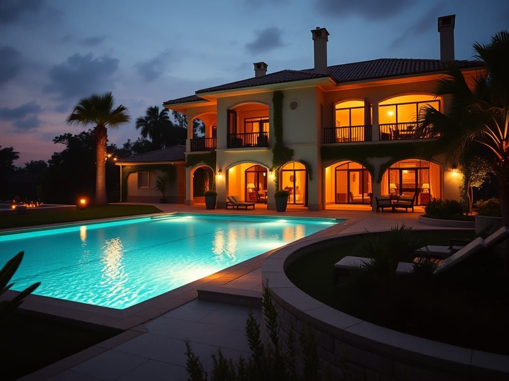 This image shows a luxurious three-story villa surrounded by a large, green garden and a shimmering swimming pool. The scene is warmly lit, cinematic, and evokes the feel of a film still.