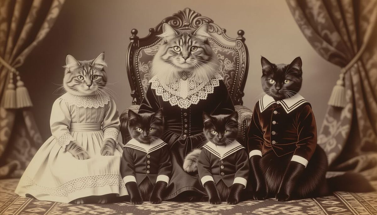 This image shows a charming, vintage Victorian-era family portrait photograph of five cats dressed in period clothing, posed in a studio setting with a soft, sepia-toned aesthetic.