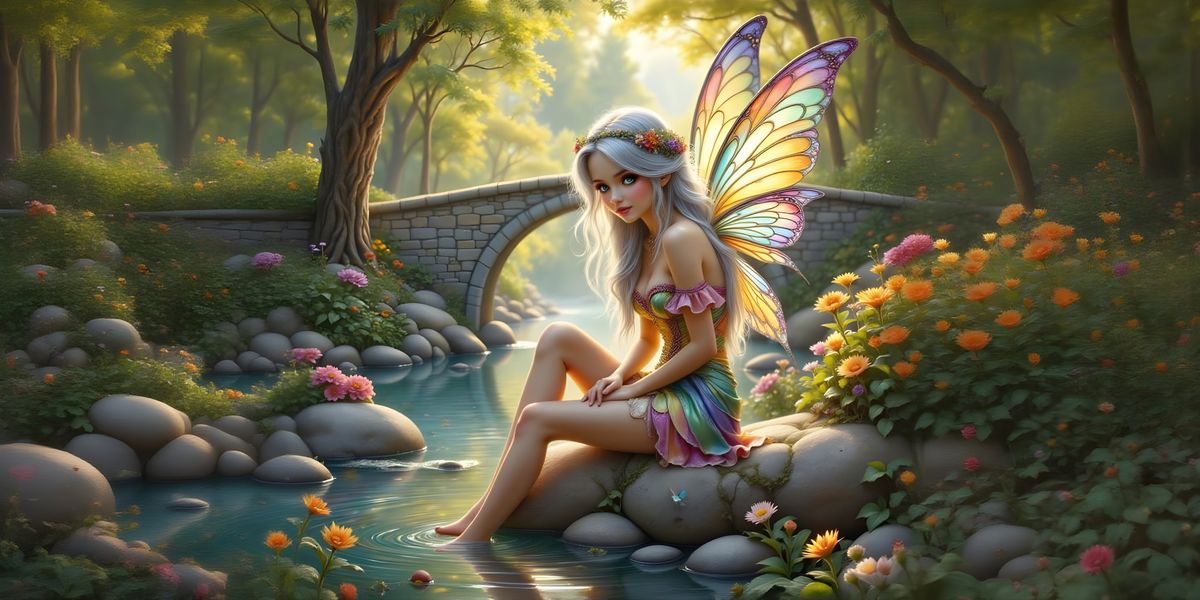 A hyperdetailed fantasy portrait of a charming male fairy with silver hair sitting by a river bridge. The image features dynamic lighting and a splash art aesthetic.