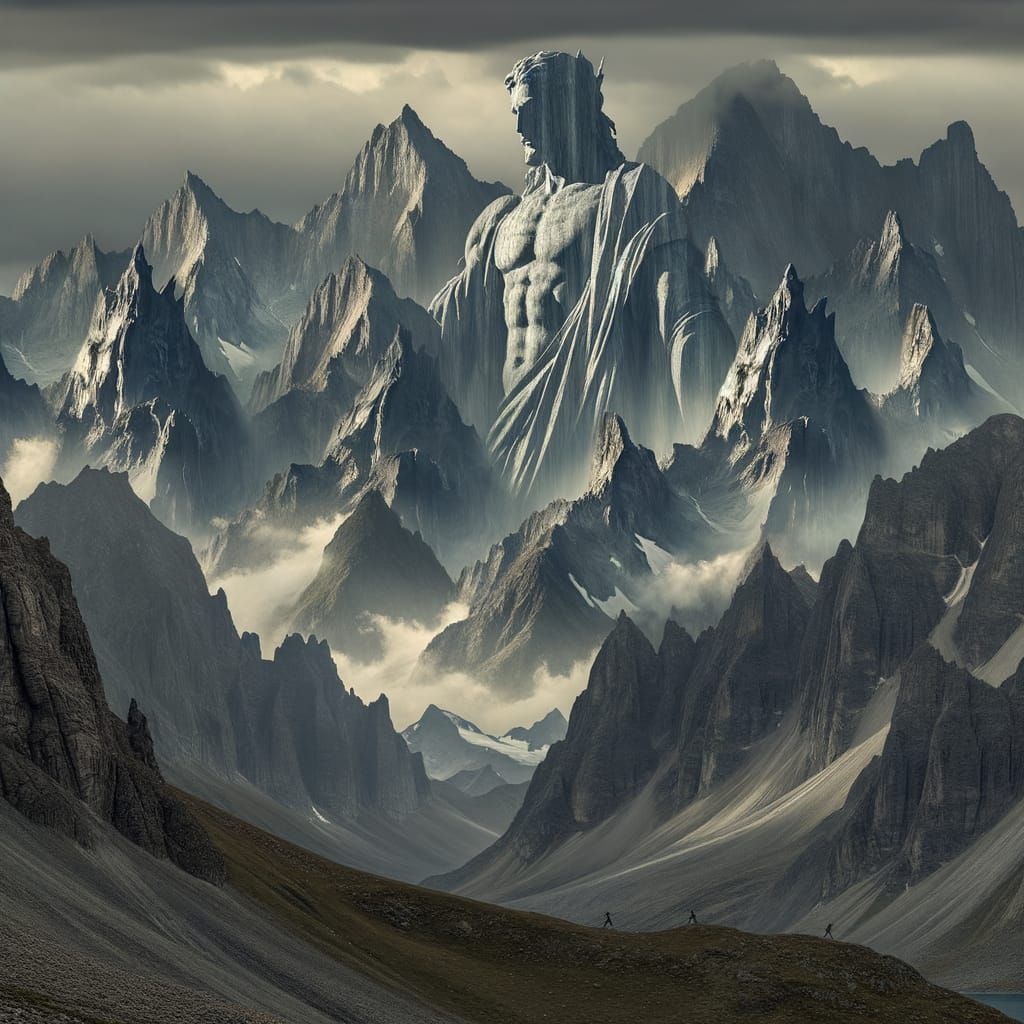 This image showcases a colossal divine figure blending seamlessly into the rugged mountains, creating a striking camouflage effect that's both majestic and mysterious, evoking a sense of epic grandeur.