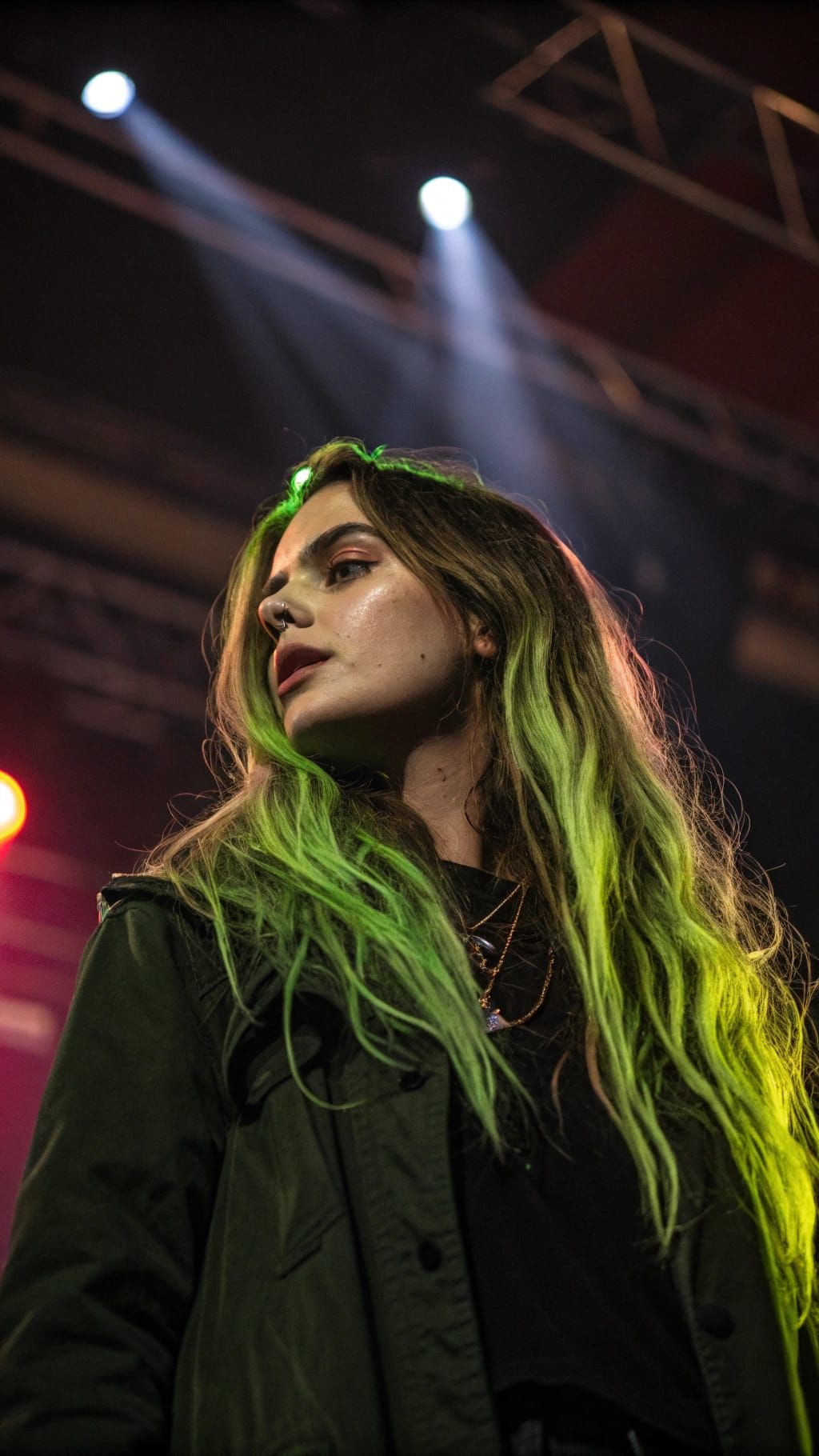 This image shows a stunning portrait of a mysterious woman with long, lime green highlighted hair, captured in a dynamic and dramatic lighting setting at a vibrant festival concert.